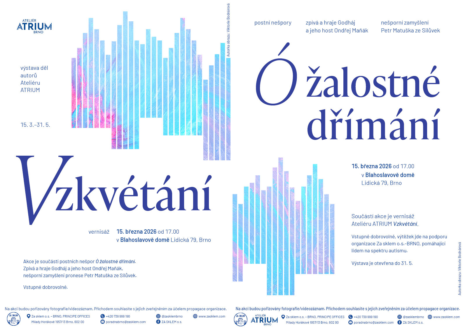 Přijměte pozvání do Blahoslavova domu na hudební nešpory, které budou tentokrát spojeny s vernisáží obrazů klientů výtvarného ateliéru Atrium, jenž funguje pod hlavičkou organizace Za sklem, o. s. pomáhající lidem s poruchami autistického spektra.