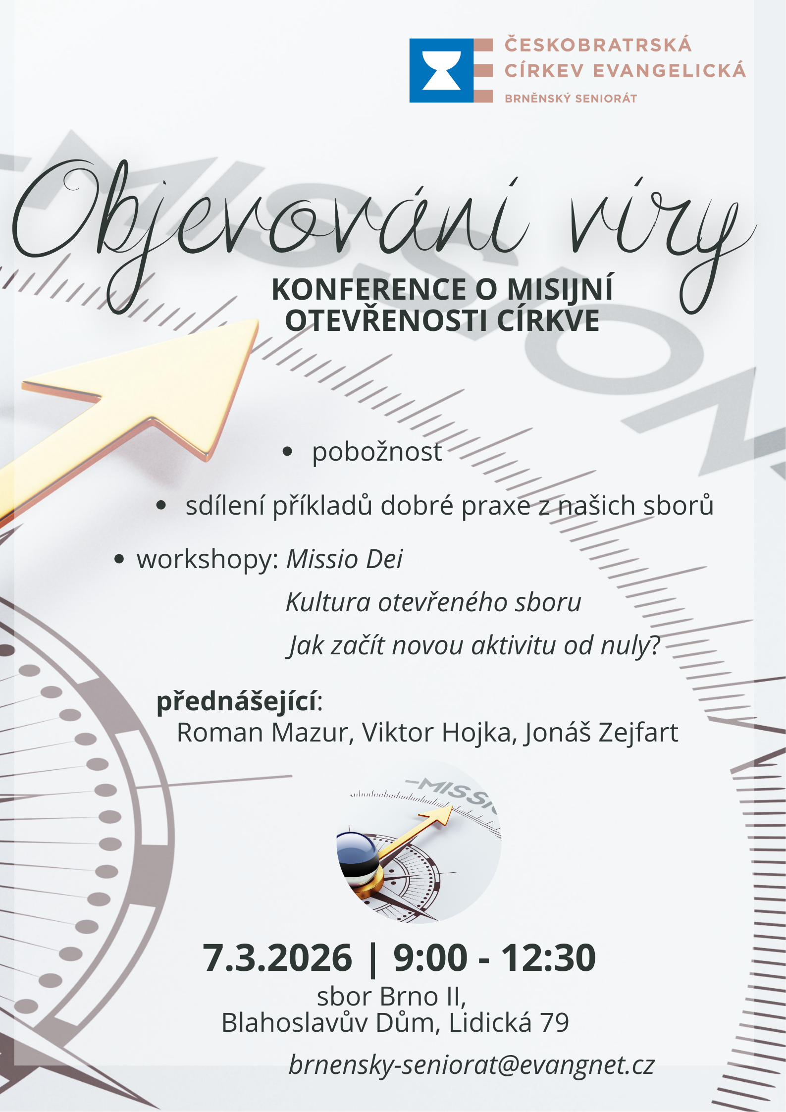 Objevování víry Seniorátní konference o misijní otevřenosti církve Číst dále about Objevování víry Datum konání So, Bře 7 2026, 09:00 - 12:30 Místo konání Brno II, Lidická 79, Blahoslavův dům Soubor k přiložení misie.png (1.45 MB)